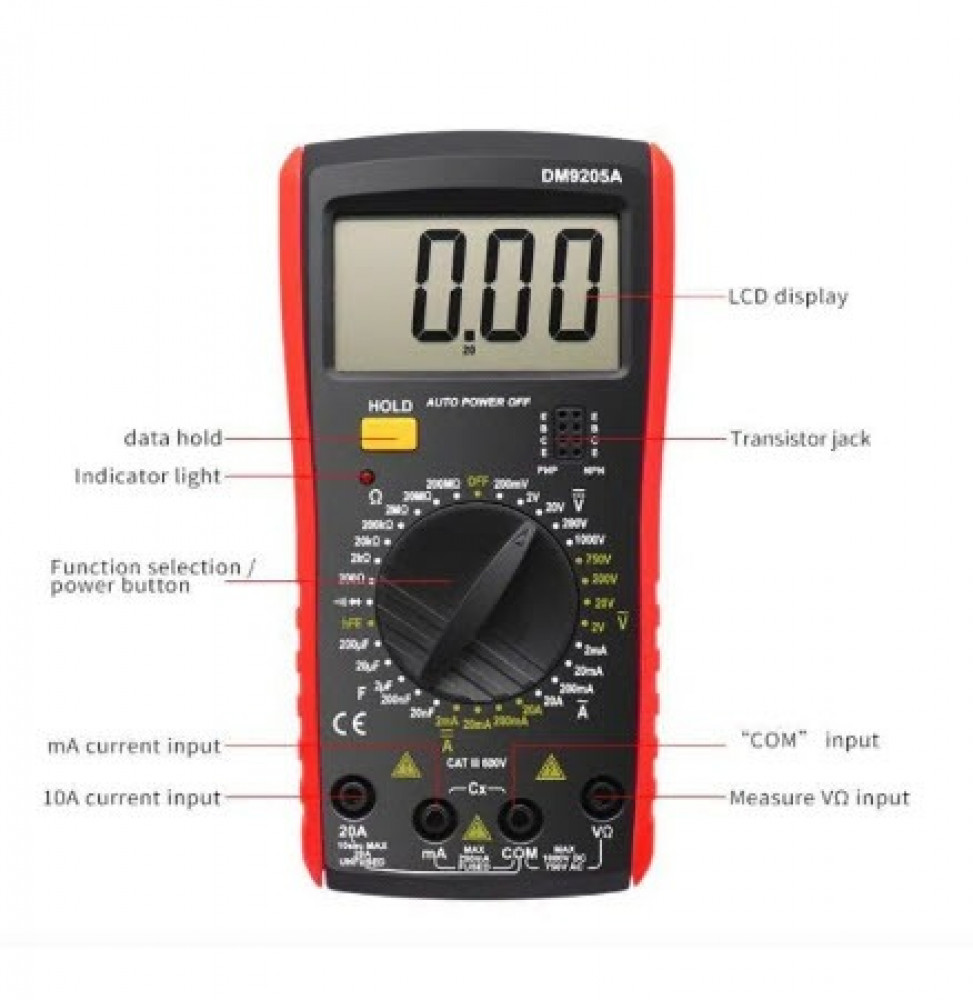 مقياس متعدد رقمي احترافي محمول باليد Dm9205a مقياس السعة الاحترافي المحمول Lcd AC / DC 1000 فولت مناسب للكهربائيين والفنيين والمهنيين الآخرين أو الهواة الذين يحتاجون إلى أداة دقيقة وموثوقة وقوية على الفور يستخدم. المواصفات: شاشة Lsd الرقمية مع صفارة مقاومة لضبط الزاوية ، وقياس سهل التعامل مع جهد التيار المتردد / تيار مستمر ، تيار مستمر ، مقاومة الصمام الثنائي ، اختبار البطارية وشاشة حماية الصمامات المستمرة: شاشة LCD رقمية 3-¹ / ² مع أقصى قراءة 1999 مؤشر قطبية: "-" يظهر تلقائيًا مؤشر النطاق الزائد: عرض مؤشر انخفاض البطارية "1" فقط حدد النطاق: درجة حرارة التشغيل اليدوية: 0 درجة مئوية إلى 40 درجة مئوية ، أقل 75٪ rh درجة حرارة التخزين: -10 درجة مئوية إلى 50 درجة مئوية ، أقل من 75٪ rh وظيفة إيقاف التشغيل التلقائي: إيقاف التشغيل بعد 15 دقيقة قياسات الخمول: المقاومة: النطاقات => 200r ، 2k ، 20k ، 200k ، 2m ، 20m ، 200m اختبار الاستمرارية: نعم => C / اختبار الصمام الثنائي: نعم الجهد الكهربائي: المقاييس => 2 فولت ، 20 فولت ، 200 فولت ، 750 فولت تيار مستمر الجهد: موازين => 2 فولت ، 20 فولت ، 200 فولت ، 1000 فولت اختبار الترانزستور: نعم تيار متردد: موازين => 2 م ، 20 م ، 200 م ، 20 أ تيار مستمر: المقاييس => 2 م ، 20 م ، 200 م ، 20 أ محتويات العبوة: 1 - جهاز رقمي متعدد 1 - يدوي 1 - زوج دليل اختبار ميزات المنتج العامة: الموديل: Dm9205a اللون: أسود وأصفر العلامة التجارية: Md Is Kit: المنتج غير مشمول: 1 - مقياس رقمي متعدد احترافي محمول باليد Dm9205a AC / dc سعة LCD متر الفولتميتر 1000 فولت